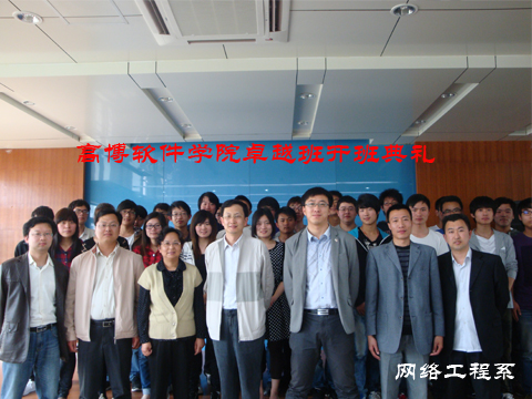 为更好的探索特色教育,践行学院“走高端、办特色、创品牌”的新一轮发展战略目标,网络工程系在历时两个月的宣传筹备后,高博软件学院首届卓越班于2012年4月23日顺利举行开班典礼。学院院长助理张燕、网络工程系主任陈雪峰、教务处处长助理胡玮、网络工程系各教研室主任以及首届卓越班全体学员出席本次开班典礼。网络工程系团委书记张纵林老师主持开班典礼。