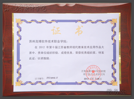 由江苏省教育科学研究院、现代教育技术研究所联合举办的“江苏省第十届教师现代教育技术应用作品大赛”于2012年5月完成评比工作。在各系、部门老师的积极配合下,我院喜获此次活动的优秀组织奖。此外,我院共有3件作品获奖。具体如下: