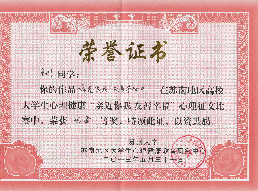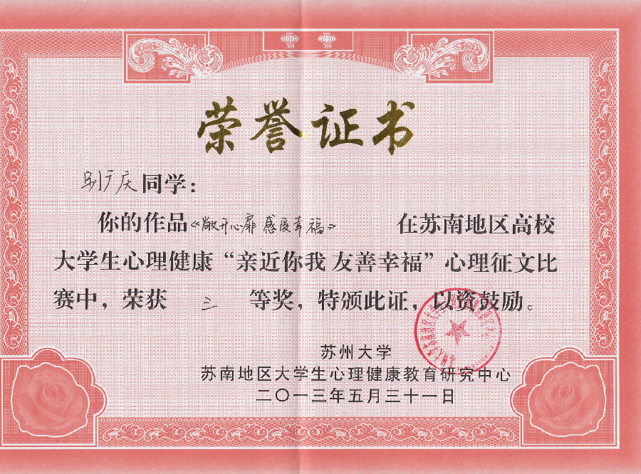 根据省教育厅苏教学函【2013】2号通知要求,为加强高校心理健康教育和辅导员队伍建设,促进大学生健康成长,苏南地区大学生心理健康教育研究中心组织了“亲近你我、友善幸福”为主题的心理健康征文和心理剧本大赛,我院选送的3篇心理健康征文和2个心理剧本均获得了良好的成绩,其中国商系1231班别广庆同学撰写的《敞开心扉 感受幸福》获得心理征文比赛三等奖,1231班的刘倩和1235班的朱利获得心理征文比赛的优秀奖;在心理剧本大赛中,我院选送的朱利作品《守望孤独的心》和李炜佳作品《dior护肤品引发的宿舍大战》获得优秀奖。