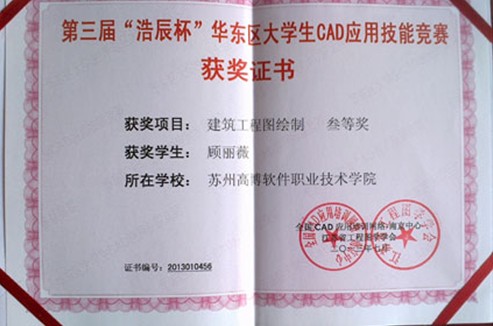 数字艺术系环境艺术设计专业选送了3名大一学生参加比赛,其中,顾丽微、吴煜雯两位同学分别获得职业院校组“建筑工程制图”单项的三等奖。赛前环艺教研室组织专业骨干教师对报名参加的三名学生进行赛前辅导,最后由徐晓霞老师带队赴南京参赛。