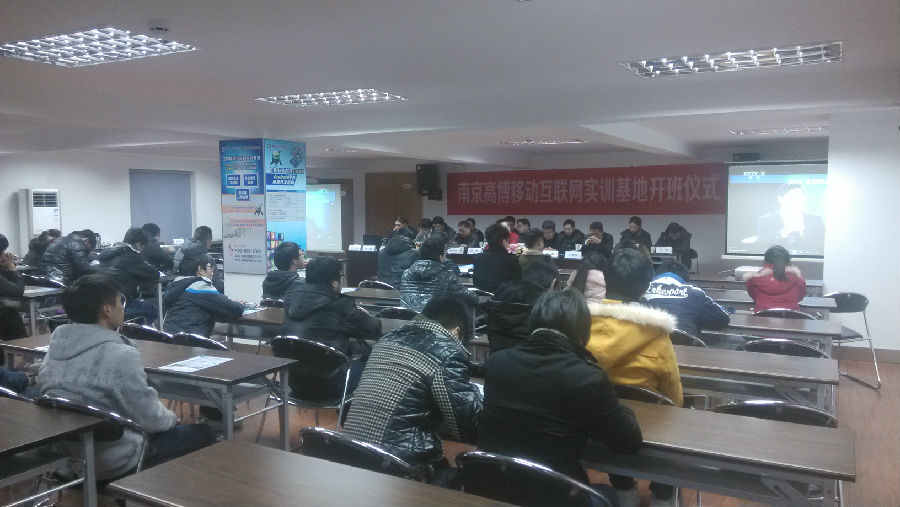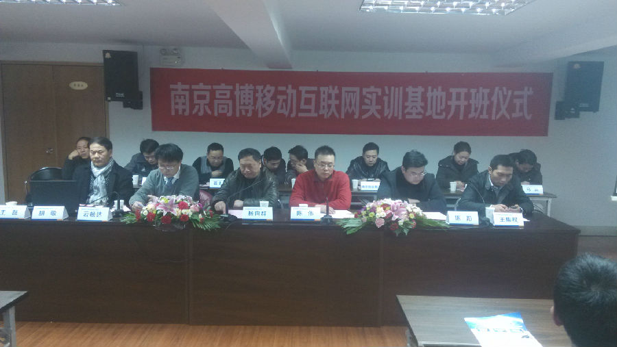 2014年1月8日下午,南京高博移动互联网实训基地开班仪式在南京市管家桥55号-南京市人才教育培训中心隆重举行。南京市人社局人才教育培训部主任陈伟、苏州高博软件技术学院副院长杨向群、南京地区相关大学招生就业部门领导、知名移动互联网企业代表以及南京相关媒体记者代表等出席开班仪式。苏州高博软件技术学院副院长杨向群、南京市人社局人才教育培训部部长分别作重要讲话,基地负责人王磊作表态性发言,基地校长胡敬主持会议。