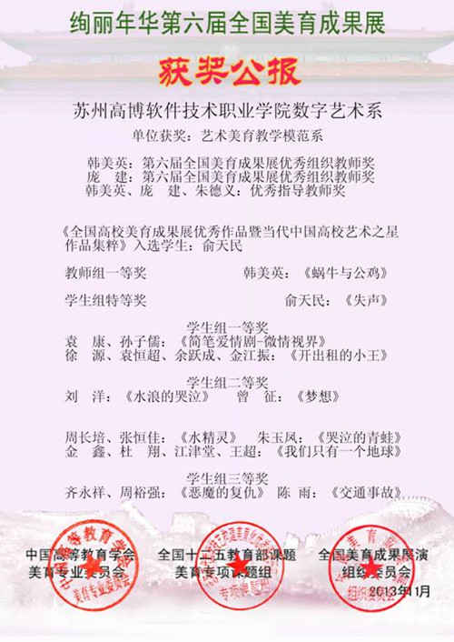2013年12月经“美育中国梦”第六届全国美育成果展专家委员会的初选、复审、终审程序后我院(原:数字艺术系)影视动画教研室师生荣获“美育中国梦”第六届全国美育成果展多个奖项。