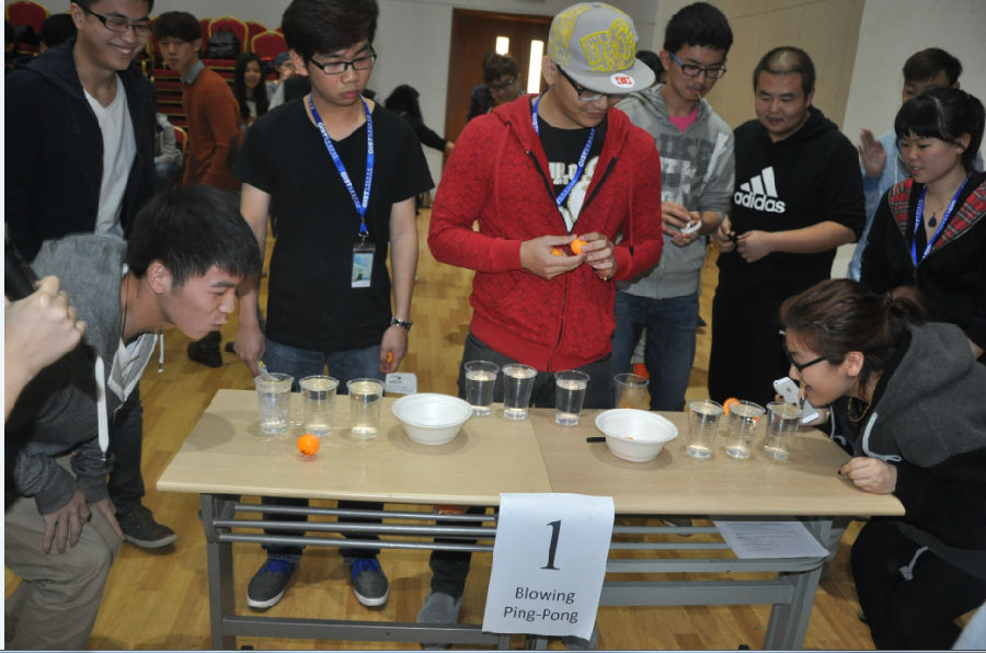 最后,激动人心的时间到了,全部新老学生参与的室内游戏比赛活动开始啦。全场有6个比赛项目,各组必须完成第一个游戏项目才能进行下一个,第一个顺利完成所有游戏比赛的小组获胜。比赛按顺序依次是:吹乒乓球、传橡皮筋、跳绳、翻转地毯、搭积木、喝可乐吹口哨。在师生们的欢声笑语中,高博国际学院2014年春季开学典礼暨欢迎仪式圆满结束。