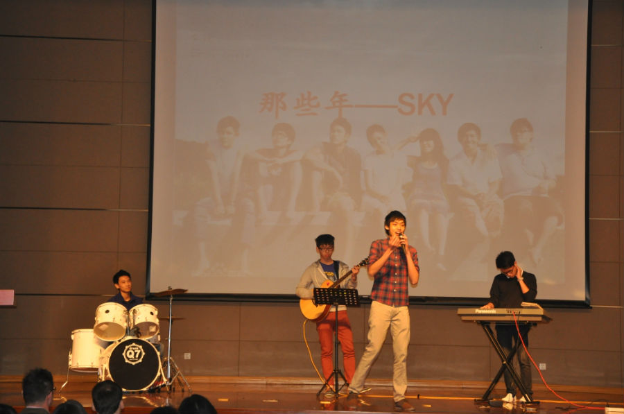 伴随着悠扬的音乐声,高博国际学院2014年春季学期欢迎仪式拉开帷幕。首先由成立于2011年的why 乐队献上三首中英文歌曲:titanium,那些年和 why。他们的精彩表演不时引发师生们阵阵掌声。