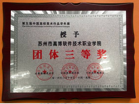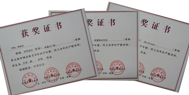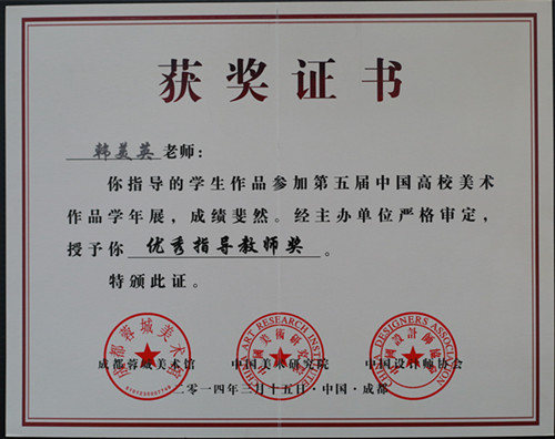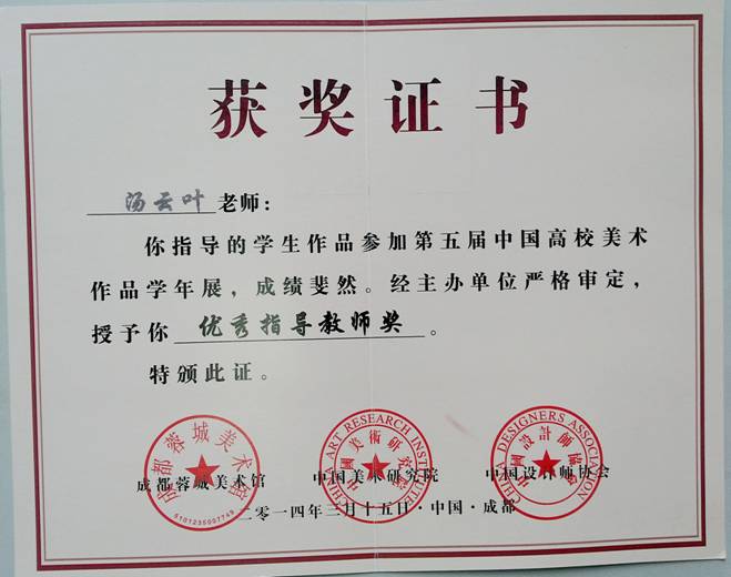 2014年3月,由成都蓉城美术馆、中国美术研究院、中国设计师协会主办的第五届中国高校美术作品学年展在成都蓉城美术馆举行,本次展出中,我院喜获团体三等奖,获优秀指导教师奖两个,入选作品二十余个,优秀作品8个。(以下是部分获奖证书)