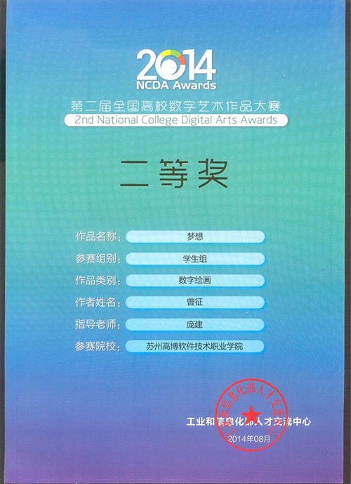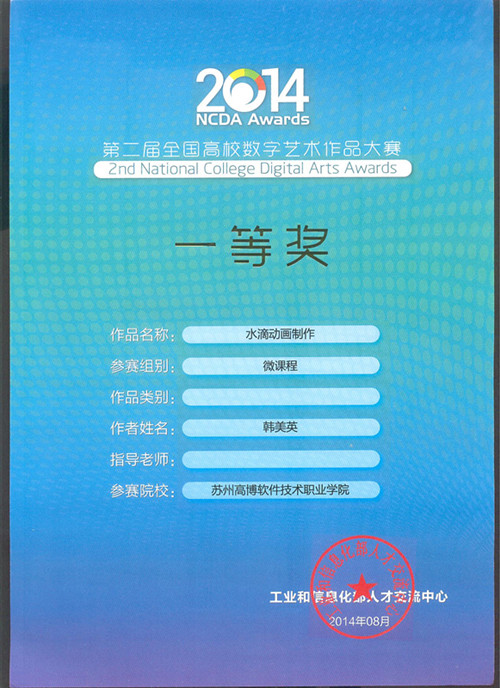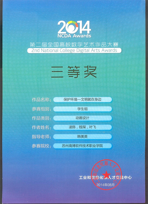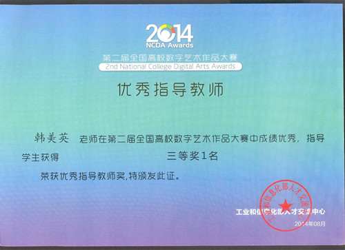 由工业和信息化部指导,工业和信息化部人才交流中心主办的“第二届全国高校数字艺术作品大赛”于2014年8月在上海圆满落幕。经过专家评审,我系师生荣获佳绩。其中韩美英老师的个人微课作品荣获教师组一等奖;学生组曾征荣获二等奖,凌陈、钱琛、叶飞荣获动画三等奖;在指导学生作品中庞建老师和韩美英老师分别获得优秀指导教师奖;特向上述师生表示祝贺。