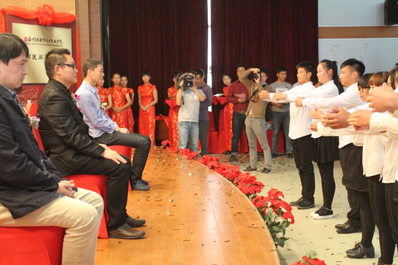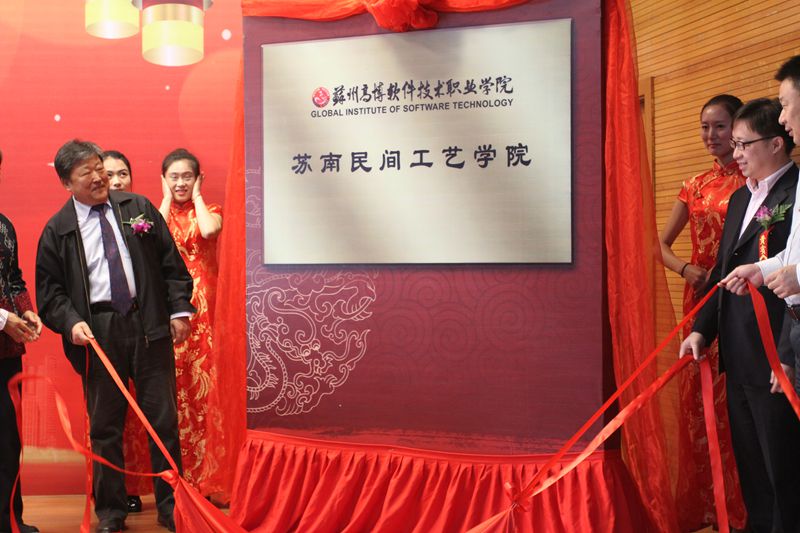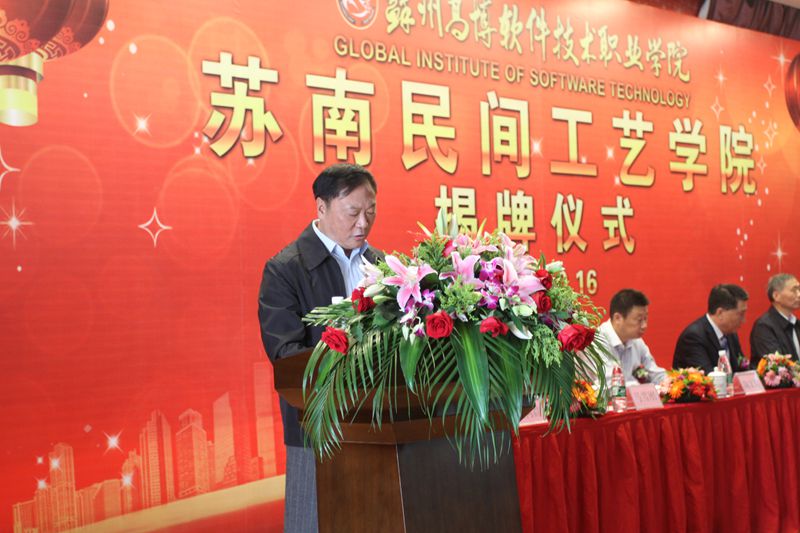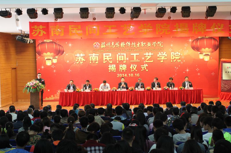揭牌仪式由李建国主任主持,杨向群副院长宣读了学院关于成立高博“苏南民间工艺学院”的决定,高新区发展局周晓明副局长、服务业发展局陶文胜副局长、文史委副主任樊宁、学院党委书记李建生为学院揭牌,苏南民间工艺学院沈德龙院长、新区东渚镇镇长马雪刚、江苏省工艺美术协会理事长马达分别发表热情洋溢的致辞,王兆明院长为“苏南民间工艺学院”特聘院长、副院长颁发聘书并发表重要讲话,他说,苏州高博软件技术职业学院“苏南民间工艺学院”的揭牌是校地共建的一项丰硕成果,学院的成立对于传承和创新民间工艺,更好地挖掘苏南民间工艺瑰宝,提升文化品位,助推文化产业发展,发挥职业教育在文化传承中的创新,培养一批具有文化创新能力的技术技能型人才具有至关重要的作用;同时学院也是落实教育部关于开展现代学徒制试点工作的要求,推进苏州在加快传统手工技艺与现代科技和时代元素相融合,不断提高民间工艺品的附加值和国际竞争力,使学院成为民间工艺走出国门、走向世界,打造出具有中国特色和地方特点的高端民间工艺产业方面的重要载体。