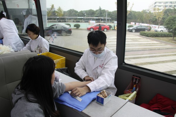 早上10点青年志愿者协会的志愿者们就在工商银行门口做好了准备工作。志愿者们在献血活动点旁边设置了献血海报,以便为同学们揭开献血神秘的面纱。现场志愿者对同学们的问题作了耐心详细的解答。献血活动开始后,路过的同学们踊跃报名;献血车上,一切工作都有条不紊。有些同学以前献过血,所以对献血流程很熟悉,不需要志愿者多做介绍。有些同学是第一次献血,志愿者们就耐心地向他们介绍献血的相关事项。有些同学献血的热情很高,却因为不符合献血条件失望而归。学院领导对本次活动十分关注,党委李建生书记亲临献血现场查看准备情况。