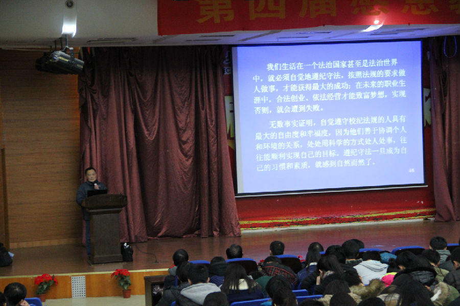 123日晚,由学生处、团委、基础部(社科部)共同组织,在学院报告厅向2013级、2014级学生进行了以学习、宣讲党的十八届四中全会精神为主题的专题讲座。讲课回顾了党的十八大召开两年来,党和国家在中国特色社会主义理论上取得的的重大创新和实践成就,重点介绍了党的十八届四中全会关于依法治国的重大战略和政治建设措施,并联系实际,探讨了依法治校,提高职业学院大学生道德、法律、人文素质的意义和实践途径。