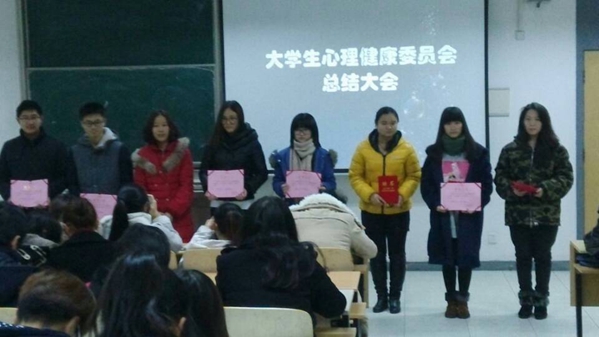 王琴老师对2014年度表现优秀的8名学生进行了表彰并颁发荣誉证书。对大学生心理健康委员会这一年的工作进行了总结。自5月份大学生心理健康委员会成立以来,开展了一系列丰富多彩的活动,尤其在苏南片心理中心举行的心理剧、征文等各类比赛中取得了优异的成绩,同学们在参加活动中得到的成长。王老师鼓励大家要有信心面对下学期的工作,在推行校园心理健康活动三级网路时要有创新和亮点,争取在明年的心理健康活动中取得更好的成绩,打造品牌专业。