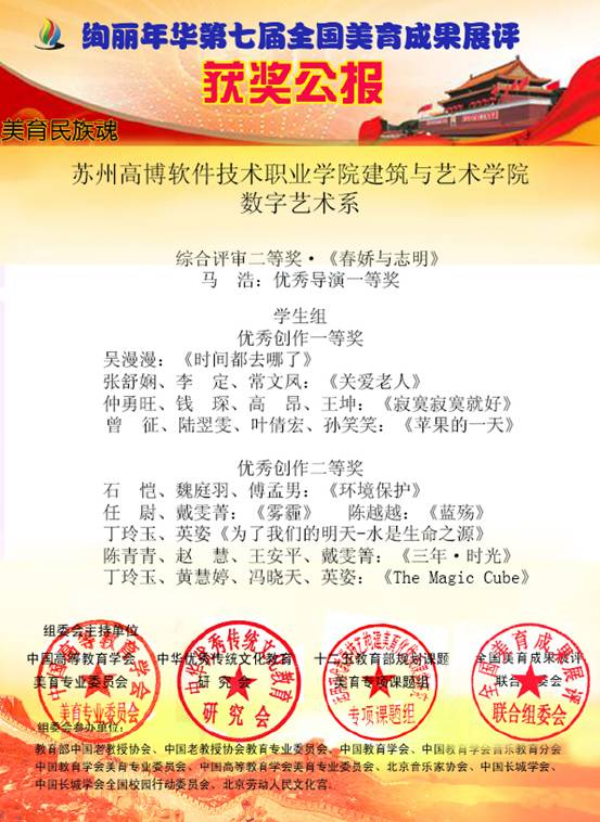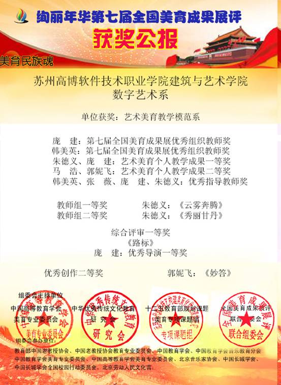 2014年12月经“美育中国梦”第七届全国美育成果展专家委员会的初选、复审、终审程序后我院影视动画与视觉传达教研室师生荣获“美育中国梦”第七届全国美育成果展多个奖项。其中,建筑与艺术学院荣获艺术美育教学模范系,马浩、韩美英、庞建、张薇、朱德义、郭妮飞等老师荣获优秀指导老师奖和个人一等奖等奖项。(建筑与艺术学院 韩美英)