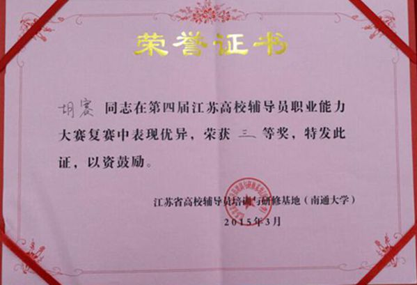大赛分为笔试(包括基础知识测试、博文写作)、主题班会、案例分析、主题演讲、谈心谈话等五个环节。笔试环节主要考察辅导员的理论素养、文字能力以及网络素养;主题演讲主要考察辅导员的语言表达能力和逻辑思维水平;案例分析环节,选手现场抽题,就案例中的“问题关键点、解决思路、实施办法、启示”进行阐述;最后一项是谈心谈话,选手根据题目要求,以情景再现的方式开展谈心谈话。大赛邀请了南通大学思政教育和学生管理工作的专家进行专业指导与点评。经过三天紧张激烈的角逐,胡赛老师发挥稳定,荣获大赛三等奖。