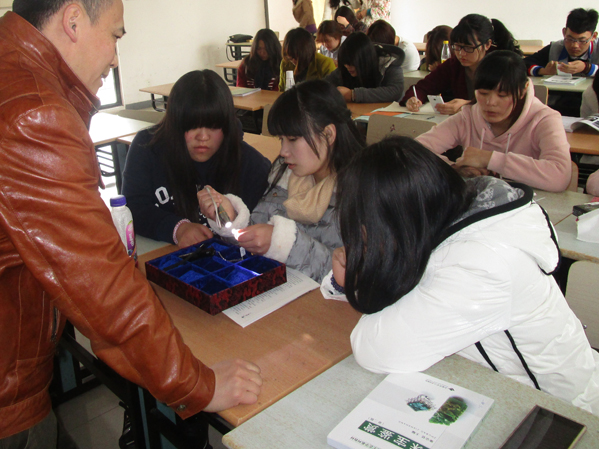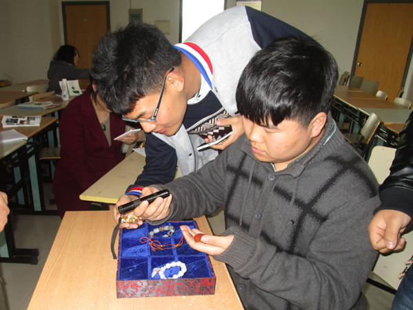 米海波大师说明本次课主要内容为鉴别老师们的玉器。拿到玉器后,同学们开始小试牛刀,运用自己所学知识,拿起放大镜、手电筒等工具开始鉴宝。同学们仔细分析自己手中玉器,并根据它们的光泽、韧度、色度、比重等属性判断玉石好坏,向老师们讲述自己的看法。米海波对同学们解答中不足之处做了补充。米海波大师还拿出专业的放大镜、紫光灯当场示范如何分辨蜜蜡、翡翠的真伪,并总结在昏暗的情况下,用紫光灯45度角照射物体,翡翠若是假的便会出现荧光,蜜蜡则相反。