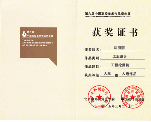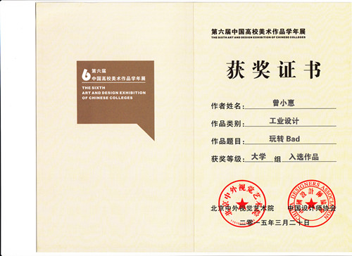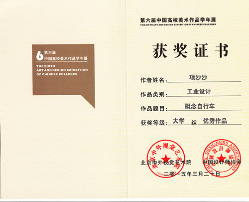 本次展出中,我院产品造型专业学生荣获以下奖项:项沙沙同学的《概念自行车》获得大学组优秀作品奖,张宁同学的《音乐电子狗》获得大学组入选作品,曾小惠同学的《玩转bed》获得大学组入选作品,沈丽丽同学的《工程挖掘机》获得大学组入选作品。产品造型专业老师荣获以下奖项:盛松梅老师荣获优秀指导教师奖,顾青青老师荣获优秀指导教师奖。(建筑与艺术学院产品造型专业 顾青青报道)