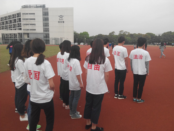 4月24日晨,12名身着印有红色字白色t恤衫的晨跑者身影,在高博操场跑道上形成了一道独特的风景线。为了更加深入贯彻社会主义核心价值观,我院国商系辅导员张志豪带领1438班同学组织了一次特别的晨跑。12名同学身着印有“富强,民主,文明,和谐,自由,平等,公正,法治,爱国,敬业,诚信,友善”24个红色大字的白色t恤衫,在跑道上晨跑。引起了其他晨跑同学的注目。