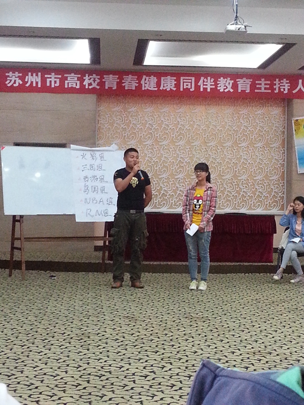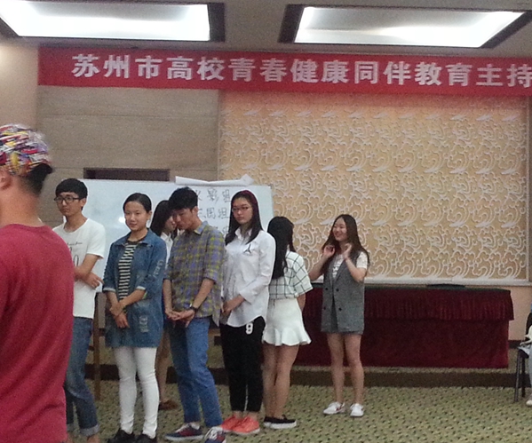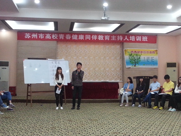 培训从5月8日晚开始,到5月10日下午结束,整个培训内容安排紧凑而丰富,既有知识讲座,也有体验式的互动,还有展现个人才能的演讲等,从多个角度帮助学生掌握担任同伴教育主持人所需要的知识和技能。共有12所在苏高校的40多名学生参加培训,其中有入围苏州市青春健康项目的11所高校和1所入围国家青春健康同伴项目的高校,担任培训师的是来自江南大学的2名有4年同伴教育主持经验的大四学生。我院学生在培训活动中成长良多,不仅全面拓展了知识,还体验了新颖有趣的活动形式,感受了资深主持人的主持魅力,更结交了志同道合的新朋友。我院学生认真参加培训,并积极主动地参与项目,其中王石同学有幸参与试讲,他利用晚上的休息时间认真准备试讲方案,套用“非诚勿扰”的表达模式,生动幽默,取得了良好的效果。