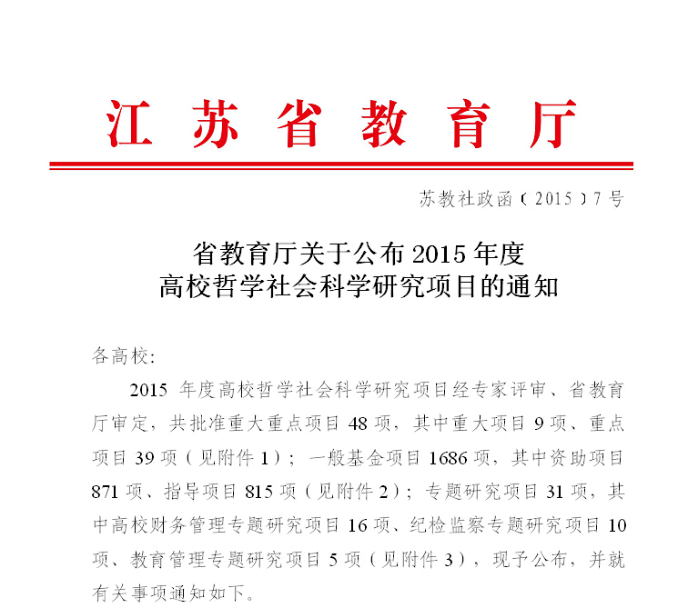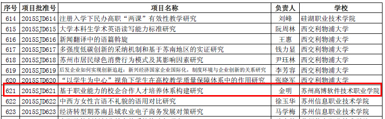 近日,2015年度江苏省高校哲学社会科学研究项目评审结果正式公布(苏教社政函〔2015〕7号),金明老师申报的项目《基于职业能力的校企合作人才培养体系构建研究》获批为基金指导项目。高校哲学社会科学研究项目,是由省教育厅设立的科研项目,具有较高的层次和影响力,我院首次获批该类别科研项目。