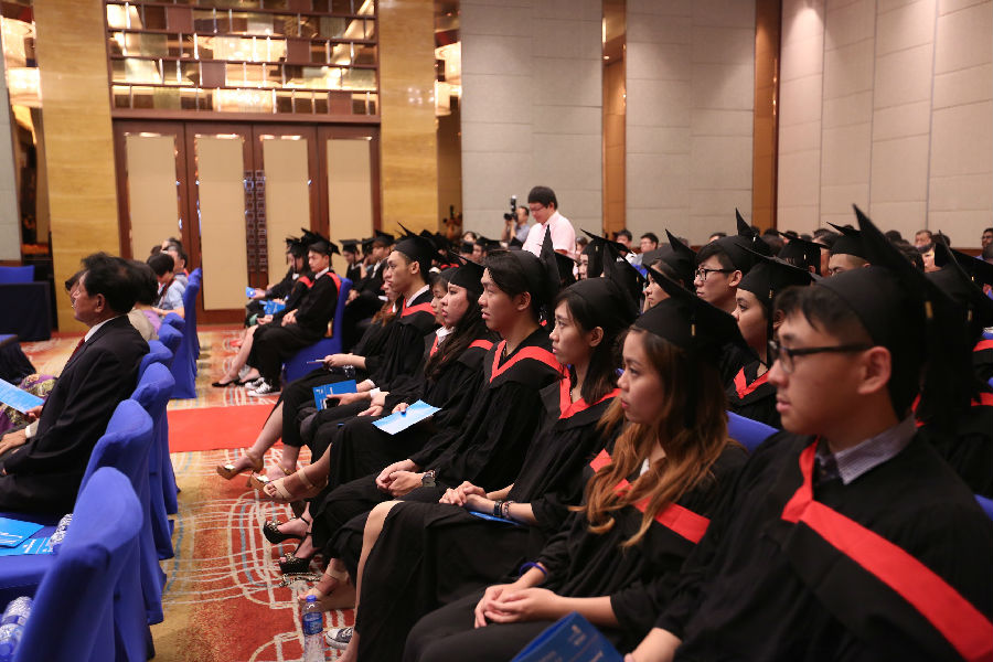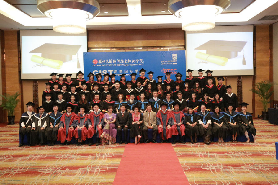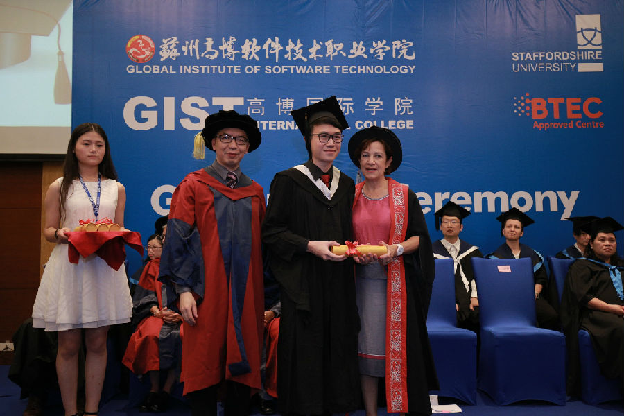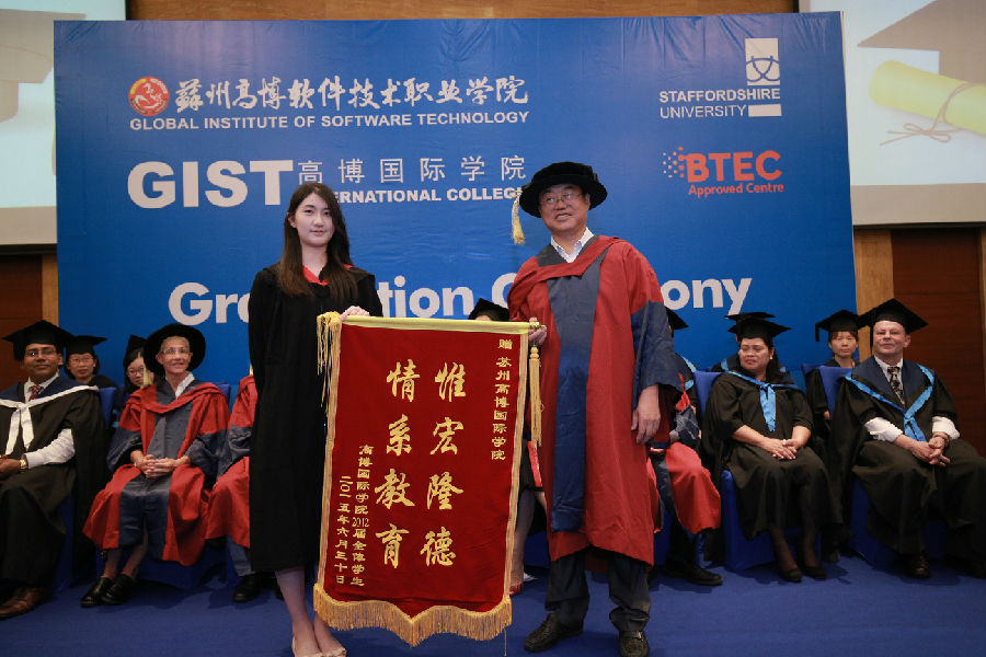 7月24日下午14:30 ,雄壮的中华人民共和国国歌和大不列颠及爱尔兰联合王国国歌,在独墅湖月亮湾相继飘荡,是什么重大外事活动?循声寻去,原来是苏州高博软件技术学院国际学院,在苏州独墅湖科教创新区福朋喜来登酒店隆重举行2015届毕业典礼,现场有21名来自于马来西亚、印度尼西亚等东盟国家的留学生和39名国内毕业生参加盛典。他们是苏州高博软件学院与英国斯泰福厦大学合作办学又一批毕业生。尤其是经过英国斯泰福厦大学学术委员会严格审核,20位同学获得学士学位,其中,kevin rinaldo等6位同学荣获一等荣誉学位。