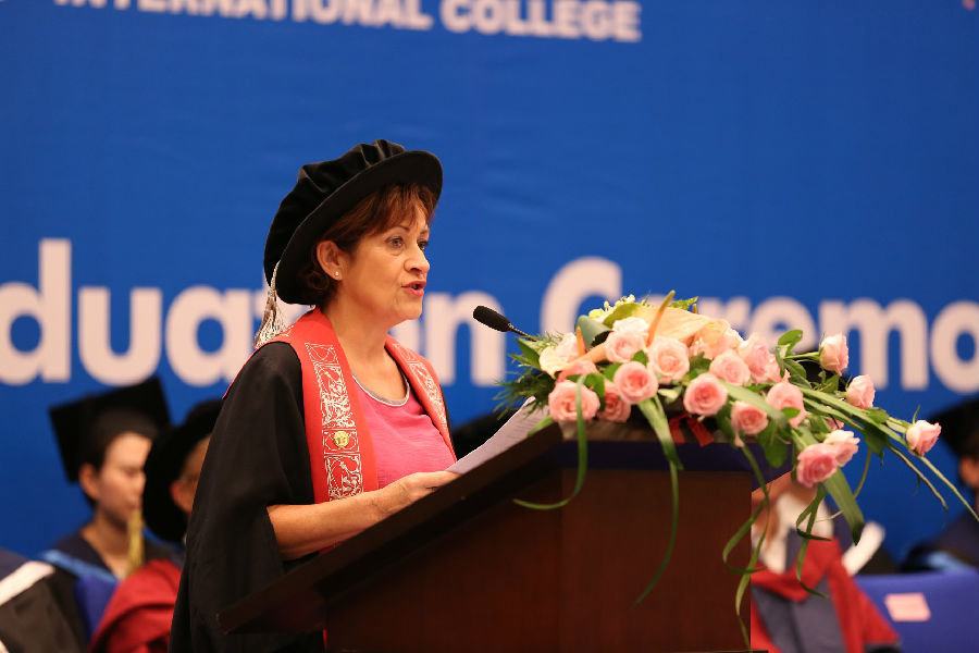 毕业典礼由高博国际学院副院长黄国豪博士与任课老师amanda女士主持。当主持人宣布毕业典礼开始后,身着导师服的中外老师跟随赵教授走进大厅。中、英两国国歌响切云霄。院长赵春铭教授致辞,祝贺他们顺利完成学业,并对全体毕业生提出殷切希望。毕业生们在欢快的音乐声中,鱼贯从学院领导、学科负责人以及chris女士手中庄重地接过毕业证,并与每一位毕业生合影留念。同学们的喜悦心情难以言表。学院领导和董事会领导分别为12位优秀毕业生颁发证书和奖学金。 优秀毕业生代表kevin rinaldo和胡一鸣同学上台,分享了四年来自己和周围同学共同学习成长的故事。姚婧同学代表全体毕业生向母校赠送锦旗,表达对母校、对师长们的不舍和眷恋。