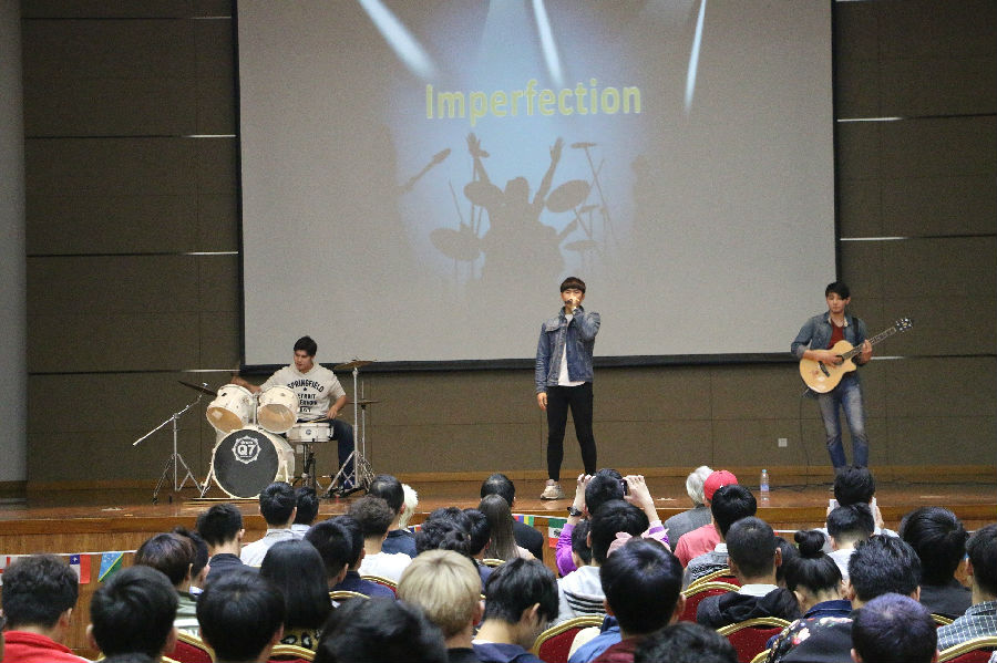 随着强劲的鼓声响起,迎新典礼在由来自于韩国和哈萨克斯坦的学生park sanghun,timur,sunggat组成的校乐队imperfection的激情演奏中拉开了序幕,一曲青春洋溢的creep成功地调动了现场气氛。