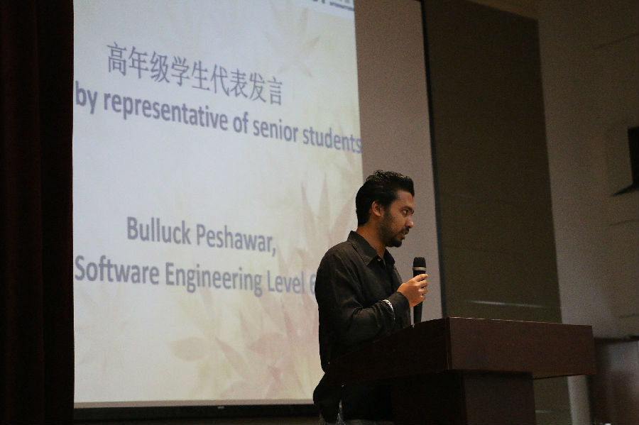 颁奖结束后,我院高年级学生来自于毛里求斯的bulluck同学与大家分享学习经验,2015级新生代表来自马来西亚的tan jing fon和王宇婷同学分别作了发言,他们真诚热情的演讲,激发了同学们奋起拼搏的斗志,点燃了他们的青春激情。