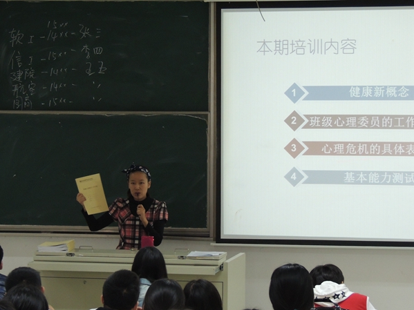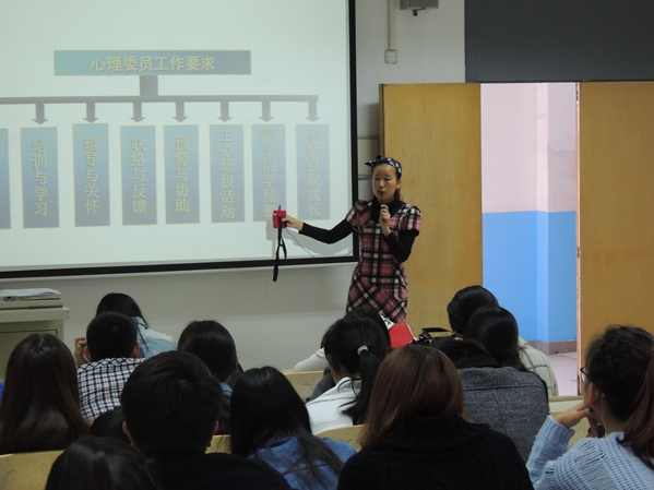 为进一步推进院-系-班心理健康工作三级网络建设,提高系/院心理辅导员和班级心理委员的心理健康工作素养,11月4日下午,大学生心理健康教育指导中心专门针对班级心理委员和专职心理辅导员进行了以“关心你周围的同学”为主题的讲座,为他们提供我院心理健康和危机干预工作要求、如何识别学生中的心理问题、如何汇报和反馈、工作中的保密和伦理原则等方面的培训。全体2014、2015级班级心理委员和各系院专职心理辅导员参加了培训。
