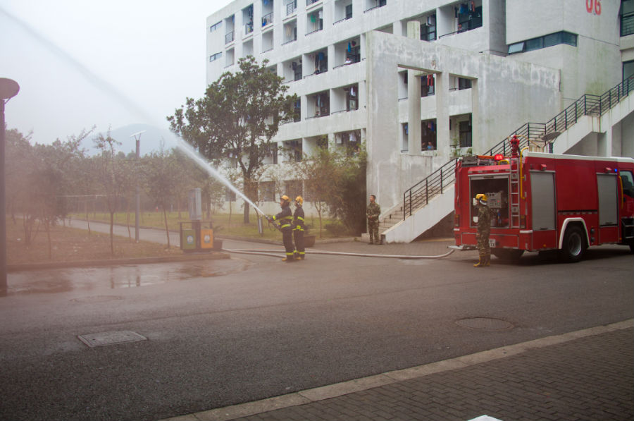 下午16点整,总指挥李建国院长助理宣布疏散演练开始,随着消防警铃拉响,烟雾弹模拟火情发生,消防车及时赶到并组织灭火。学生在班干部和辅导员老师的指挥下,宿管员及保安在所有楼梯及出口处接应,以防止学生因慌张拥挤而造成摔伤和发生踩踏事故。全体2015级新生紧急有序地按指定的路线迅速撤离至安全地带。各系部维持纪律,清点人数,并向总指挥报告。随后,消防中队警官现场为学生们讲解了突发火灾时逃生疏散的注意事项和灭火器的使用方法并组织学生代表实际操作。