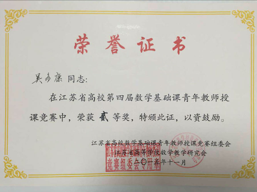2015年116日至8日,江苏省教育厅在泰州学院举行江苏省高校第四届数学基础课青年教师授课竞赛,经过激烈角逐,我校基础部吴多康老师荣获二等奖。