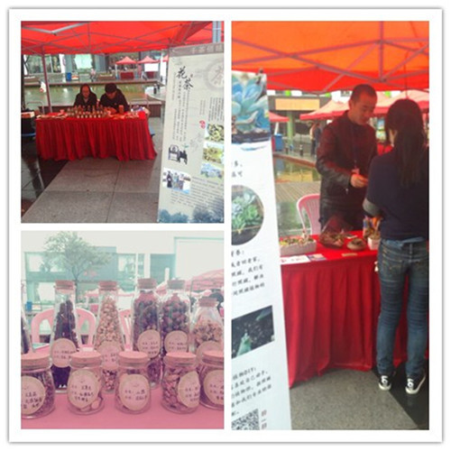最后压轴的当然是软工系14级团队的千茶百味茗品营销,没错,就是――茶,在展台的牌子上我们可以看到关于茶的知识,而端坐在台上的瓶子也格外引人注目,那些花茶的颜色各异,而花的形状也是特别的美丽。当然,不仅仅是外表,从团队人员的介绍来看,这些花茶还有不少医疗功效呢,对于需要去肝火,减肥,排毒养颜的人群也是不错的选择!