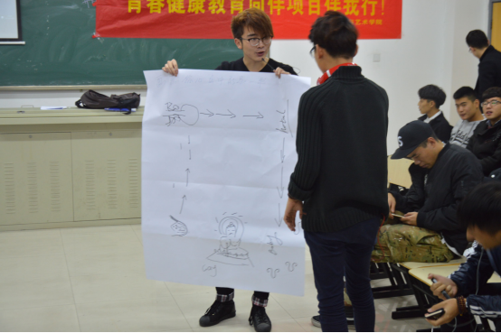活动在主持人郭守浩、赵雪婷的自我介绍下正式开始。整个“同伴教育”活动由开幕式、爱情观大讨论、情景模拟、互动游戏、如何正确使用避孕套等几个部分组成。活动刚开始为了调节气氛,主持人邀请大家一起做“人名马拉松”的游戏,同学们都很快进入了角色,活动顺利展开。 为了能够使活动有序地进行,主持人宣布了“尊重、负责、开放接纳、倾诉、保密”的活动公约。活动过程中,主持人以“了解艾滋病”为切入点,引导学生们以科学自然的心态认识艾滋病。为了让同学们对艾滋病有更深的了解,现场放映了有关艾滋病的视频,气氛热烈。参与活动的学生纷纷表示受益匪浅,不仅从思想上消除了对艾滋病认识的误区,也学会了尊重艾滋病患者。