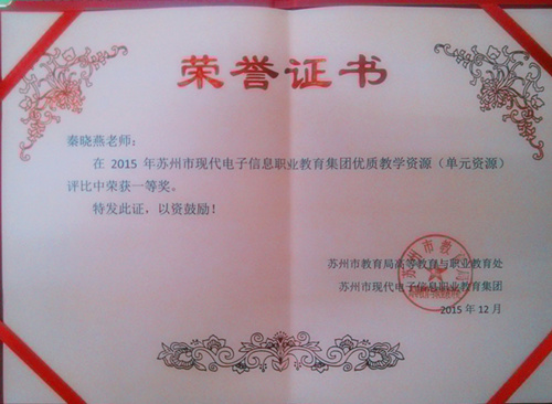 2015年12月,软件工程系参加了苏州市现代电子信息职教集团优质教学资源评比活动,参赛院校包括苏州职大、苏州经贸、苏州工业职业技术学院等苏州市高职院校。经过前期初选,最终遴选出24项资源参加最决赛。经过专家网上预览、现场展示、答辩等环节,共评出优质课程类资源8个,单元类资源13个。我系秦晓燕老师、郑永爱老师分获优质单元类资源一、二等奖。评比过程中还安排了专家选手交流活动,职教集团朱利军教授、周德富教授等资深专家对参赛作品给予较高评价,同时对进一步提高资源建设水平、资源推广使用等方面提出了很多建设性意见。