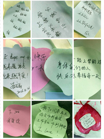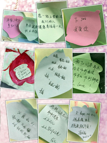 信息工程系学生会成员和班级心理委员们在布置好现场后,热情邀请路过的老师、同学参与到活动中来,一时活动现场热闹非凡。活动的内容是在便签纸上写出对最爱的人的一句话,大家纷纷寄情在小小的卡片上:有恋人之间互相传达的爱意、有朋友之间互相传达的友情、也有对远方父母深深地思念……。便签纸越来越多,宣传栏上也慢慢被布满,散发着愈来愈浓爱的气息。