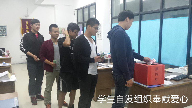 2016年2月份,艺术学院环境艺术设计专业1418班徐俊杰同学被查出患“横纹肌肉瘤”,3月份在上海几家医院接受治疗。得知此情,辅导员胡赛老师及时与家长和学生沟通。随后,辅导员老师和班长包洲前往上海看望该生并了解其病情。为帮助该生走出人生困境、解决治疗费用,4月12-13日,艺术学院师生自发组织为该生捐款献爱心活动,大家慷慨解囊,伸出援手,奉献爱心,共募集善款16398.18元。