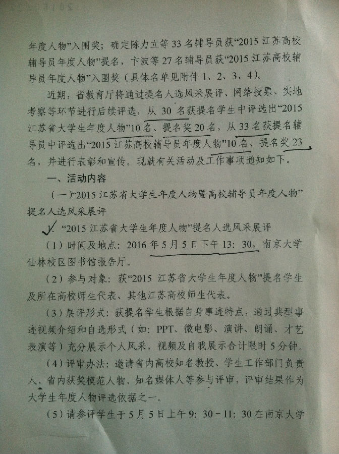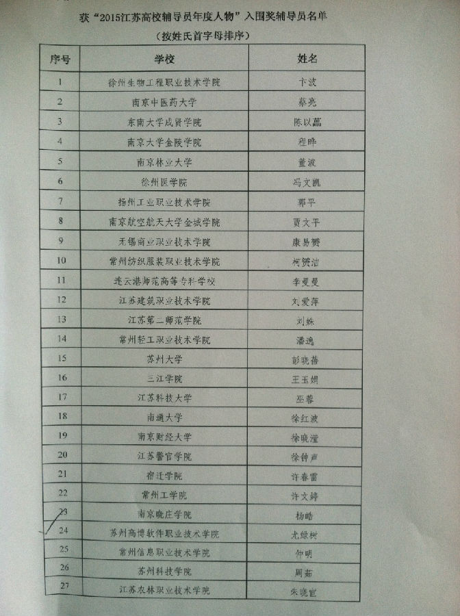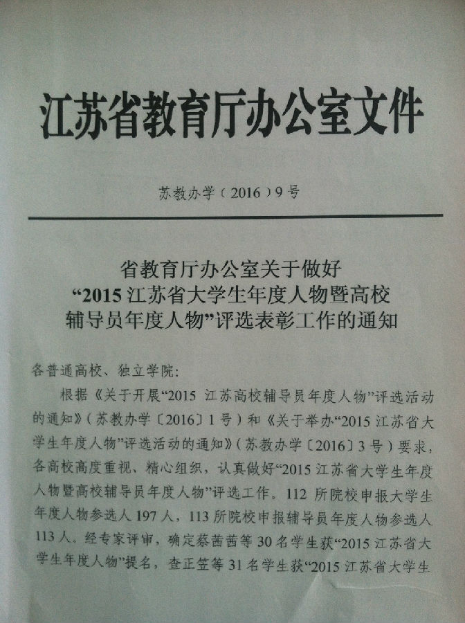 今年3月,为选树辅导员先进典型,展示辅导员队伍建设的优秀成果,我院根据《省教育厅办公室关于开展“2015江苏高校辅导员年度人物”评选活动的通知》开展了优秀辅导员遴选上报工作。经过评选,我院推荐的尤绿树老师获得“2015江苏高校辅导员年度人物”入围奖。