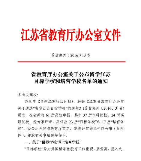近日,省教育厅公布留学江苏目标学校和培育学校名单(苏教办外�2016�13号),我院被评为“留学江苏目标学校”。