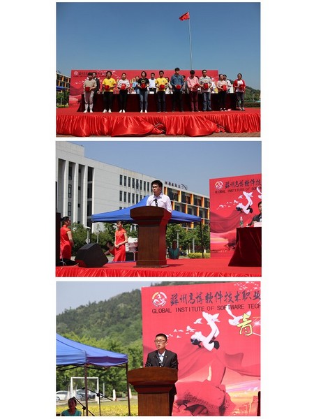 在庄严的国歌声中,本次活动的第一部分红五月表彰大会正式开始,学生处副处长吴歧范担任主持。团委书记邹艳星从团的改革发展、思想政治及价值观引领、品牌工作项目、基础团组织建设等方面就学院团委一学年的工作进行了总结。随后由教务处处长马祥兴、学生处处长王绍福、后保处副处长孙宝珠宣布了红五月的各项表彰决定,主席台领导为获奖学生代表进行了颁奖。省三好学生褚梓龙同学代表获奖同学进行发言,他表示会继续努力学习,将“五四”精神传承和发扬。信息工程系团总支书记钱国君代表基层团组织书记发言,他表示会继续按照学院党委和团委的要求做好基层团的工作,争创佳绩。紧接着高新区团委书记方芳讲话,她希望同学们享受大学生活,享受高新区的人文山水。最后由学院党委副书记郎勇生讲话,他在充分肯定学院团委取得的成绩的基础上,根据习近平总书记在今年五四前夕的讲话精神,给同学们提出了几点希望:一是要坚定信念,始终保持蓬勃向上的朝气;二是要练就本领,始终保持勤学善思的才气;三是要锤炼品格,始终保持引领新风的正气;四要勇于担当,始终保持砥砺奋进的志气。至此,第一部分表彰大会到此结束。