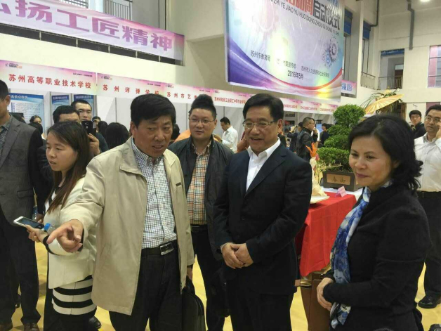 5月13日,2016年苏州市职业教育活动周启动仪式在苏开幕,苏州市副市长徐美健、苏州教育局局长顾月华出席开幕式并兴致勃勃地莅临苏州高博软件技术职业学院展位调研视察,学院党委副书记郎勇生,院长助理、学院招生就业处处长李世明陪同视察。