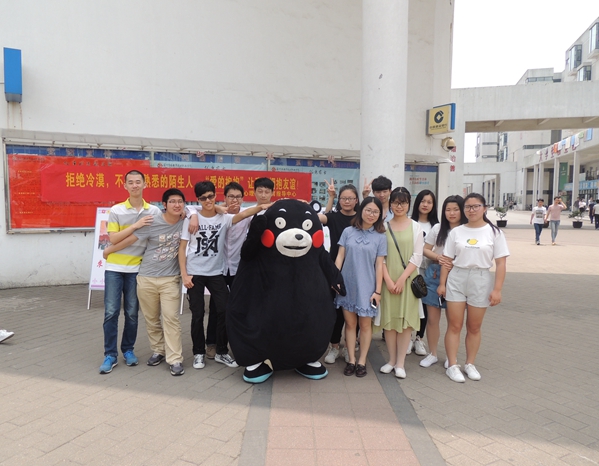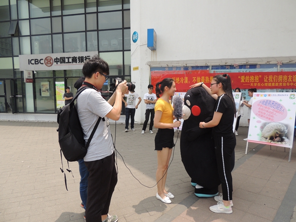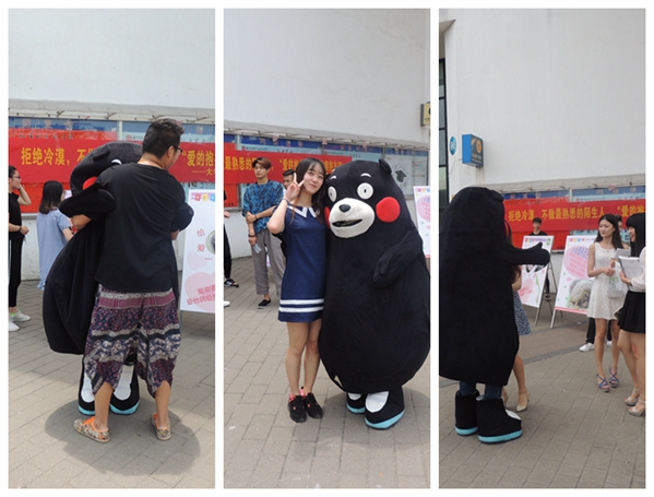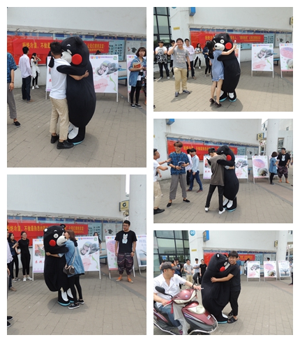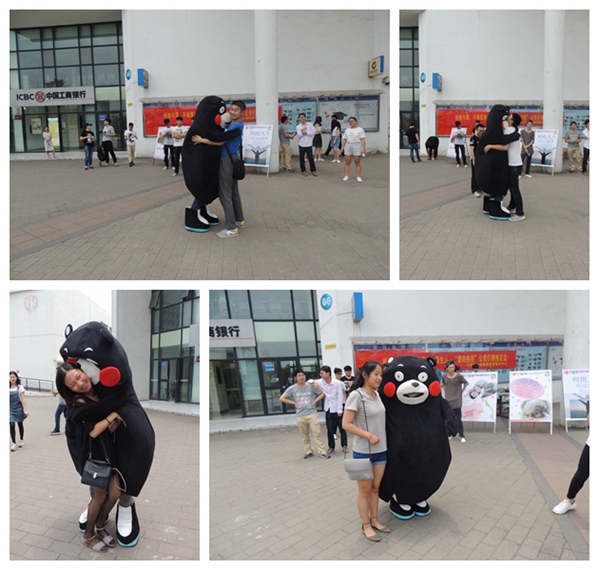 当学生干部穿上“熊本熊”的卡通服饰,笨拙得在校园里走动时,几乎所有的同学都停下了脚步,拿出手机拍照,大家都认出了这个可爱的卡通形象,小声笑着议论着,当“熊本熊”走向他们要拥抱时,有的同学笑着跑开了,觉得不好意思,也有一些同学大方的进行了拥抱。中午的温度近30度,学生干部的热情却更高,他们轮流穿上卡通服装,向认识的和不认识的同学传达拥抱的意向,传达我们活动的意义:不做最熟悉的陌生人,张开双臂让我们拥抱友谊!