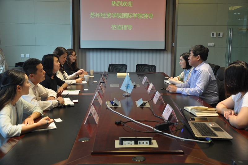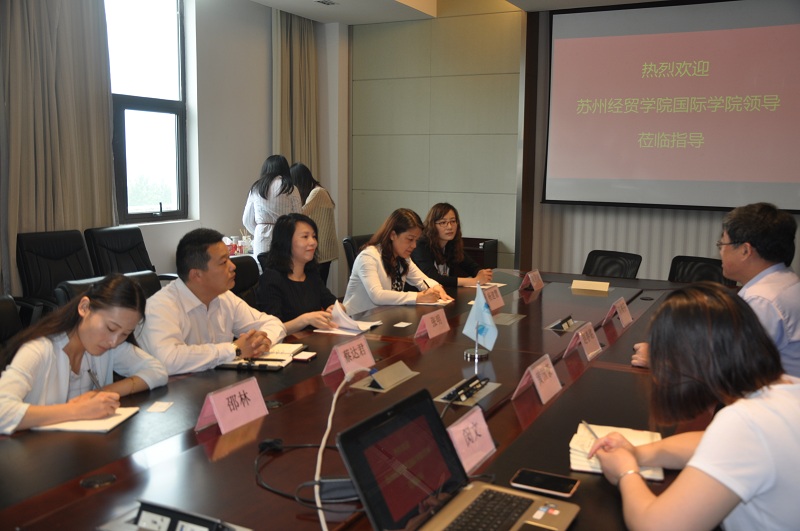 自从本月初省教育厅公布我院成为首批“留学江苏目标学校”以来,我院的国际化办学特色受到社会和同类院校高度关注。2016年5月26日上午,苏州经贸职业技术学院对外合作处处长、国际学院院长张明副教授一行5人专程到我国际学院访问交流。国际学院院长赵春铭教授热情接待了兄弟院校的同行,详细介绍了我院国际合作办学项目进展状况、国际留学生的学习和生活现状,与苏州经贸学院的领导们分享了我院在国际合作办学、留学生管理方面的经验和取得的成果。就如何做好留学生招生工作、留学生课程设置、职业规划等问题,双方进行了广泛的探讨。