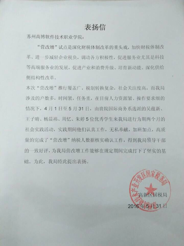 一直以来,学院高度重视与高新区国税局的合作项目,项目的推进与实施得到了校企合作办,财务处、教务处、学生处以及后勤处等有关部门的支持与配合。学生们在工学结合中取得了收获,也证明了自己的价值。苏州高新区国税局领导对参与工学结合的学生们给予了充分肯定,并特地向学院发来表扬信,感谢我院长期以来的大力支持和帮助。
