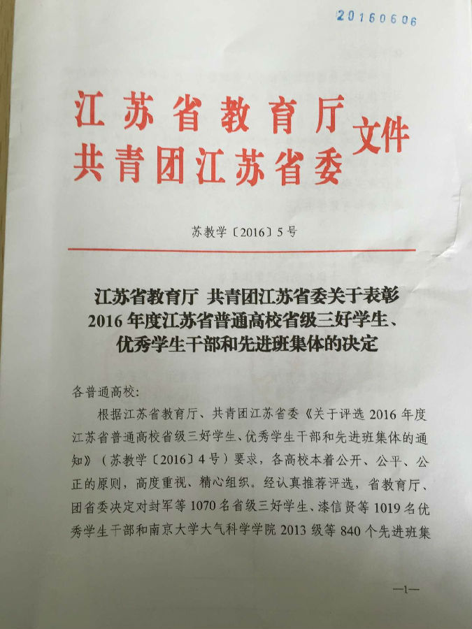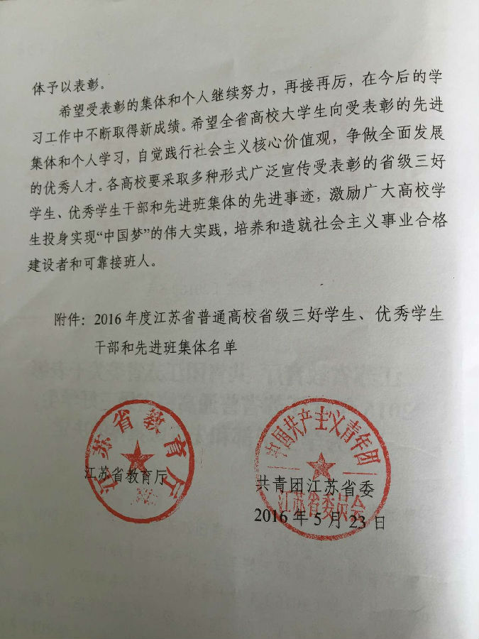 日前,江苏省教育厅和共青团江苏省委发布了《江苏省教育厅 共青团江苏省委关于表彰2016年度江苏省普通高校省级三好学生、优秀学生干部和先进班集体的决定》,我院推荐的先进个人和先进集体全部通过审核,具体获奖名单如下: