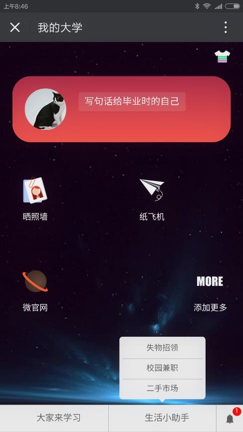 1、实现功能:现已开通“招生微站”和“我的大学”两个功能,从学生进校前和入校及毕业后都能有相关栏目找到合适的内容。