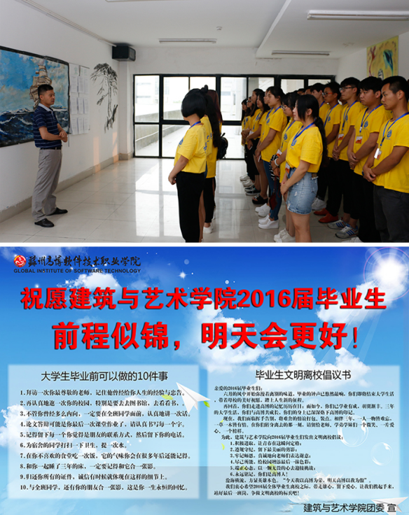 面对今年毕业生工作的新变化、新挑战,建筑与艺术学院多次召开毕业生工作会,进行周密部署,制定毕业生工作方案,成立毕业生离校工作领导小组及突发事件协调处理小组,并通过宣传栏、楼道标语等途径对毕业生进行文明离校倡议,为毕业生离校工作做好了充分的准备。为了服务好毕业生,建筑与艺术学院挑选40多名大一大二学生志愿者,并对他们进行精心的培训。在毕业生办理离校手续的过程中,志愿者们积极协助毕业班辅导员完成了收发材料、信息登记、维持现场秩序、昼夜巡逻等工作,同时为毕业生送水、拍照、搬送行李等热情的服务。