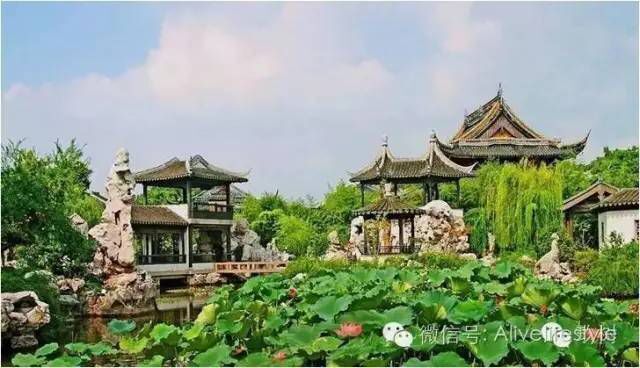 2,水池最南岸假山贴墙,树木翠竹遍植,花开艳丽,粉墙之中的花窗外便是山塘街;