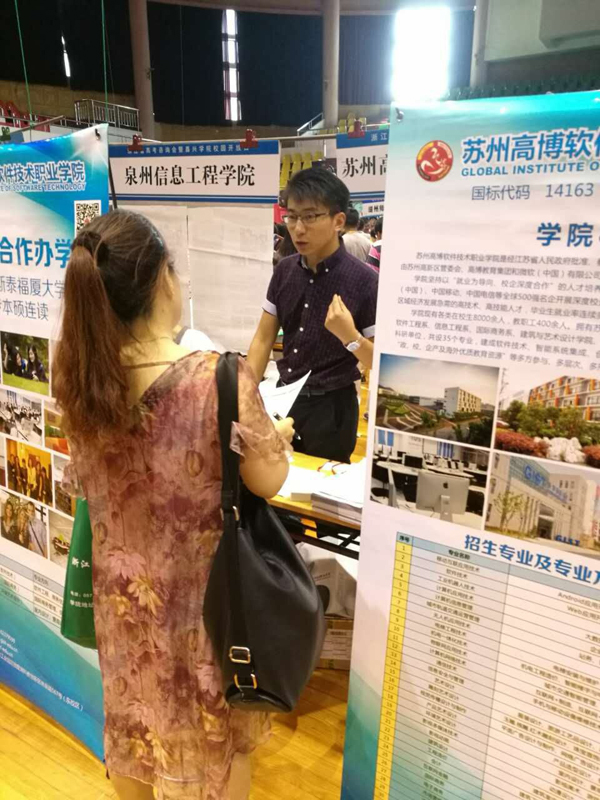 7月23日,苏州高博软件技术职业学院2016高考招生分组核心成员、学院招生就业处办公室主任张青、招生骨干吴鑫分赴浙江省嘉兴市积极开展高考招生咨询会活动。
