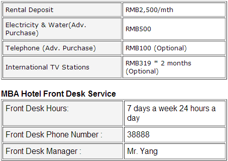 Free TV service isavailable in the sitting hall in each room. A remote control is provided ineach apartment. There are more than 70 Chinese TV stations. CCTV9 (Channel 20)is the only English station. Students can subscribe for International TVstations. To subscribe and activate the international stations, students shouldbring their passport, together with a monthly subscription fee of RMB319, toMBA Hotel’s front desk to register. Should the students want to disconnect theinternational stations, ONE (1) week notice should be given to the front desk.