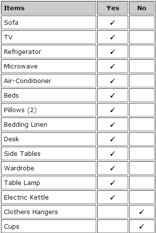 MBA Hotel willprovide free housekeeping once a week. This includes making beds. Bed sheetswill be changed once every 2 weeks. No towels and other personal laundry willbe handled by housekeeping.