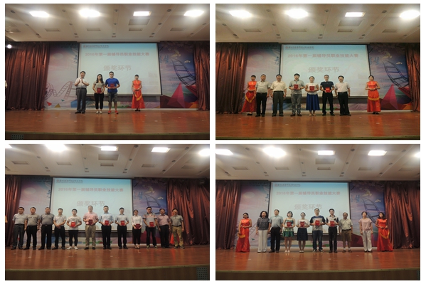 最后,主持人袁晖宣布学院首届辅导员职业技能大赛成绩:蔡金娟、孙新志荣获一等奖;肖俊、钱国君、郭妮飞荣获二等奖;张志豪、杨雪萍、孟丽、方世超荣获三等奖;李晓光、张红、王一迪、顾诚 、唐寒林、王国东荣获优秀奖。与会领导和评委为获奖选手分别颁奖。