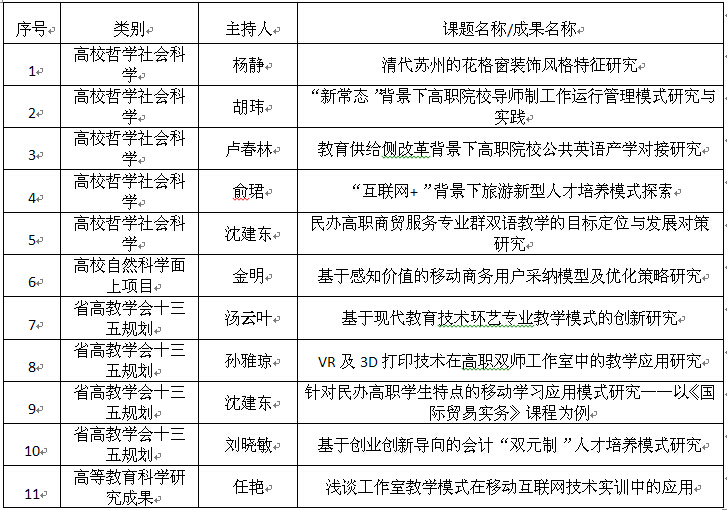2016年度江苏省高校哲学社会科学研究项目、高校自然科学研究面上项目、2015年度高等教育科学研究成果奖评选、江苏省高等教育学会“十三五”高等教育科学研究规划课题评审工作已经结束,在学校申报基础上,经专家评审,我院共5项哲学社会科学1项自然科学4项高等教育规划课题获批立项,1项高等教育科学研究成果获三等奖,分别为: