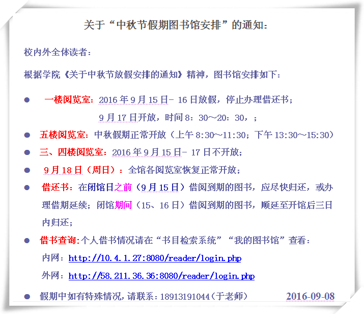 关于“中秋节假期图书馆开放安排”的通知